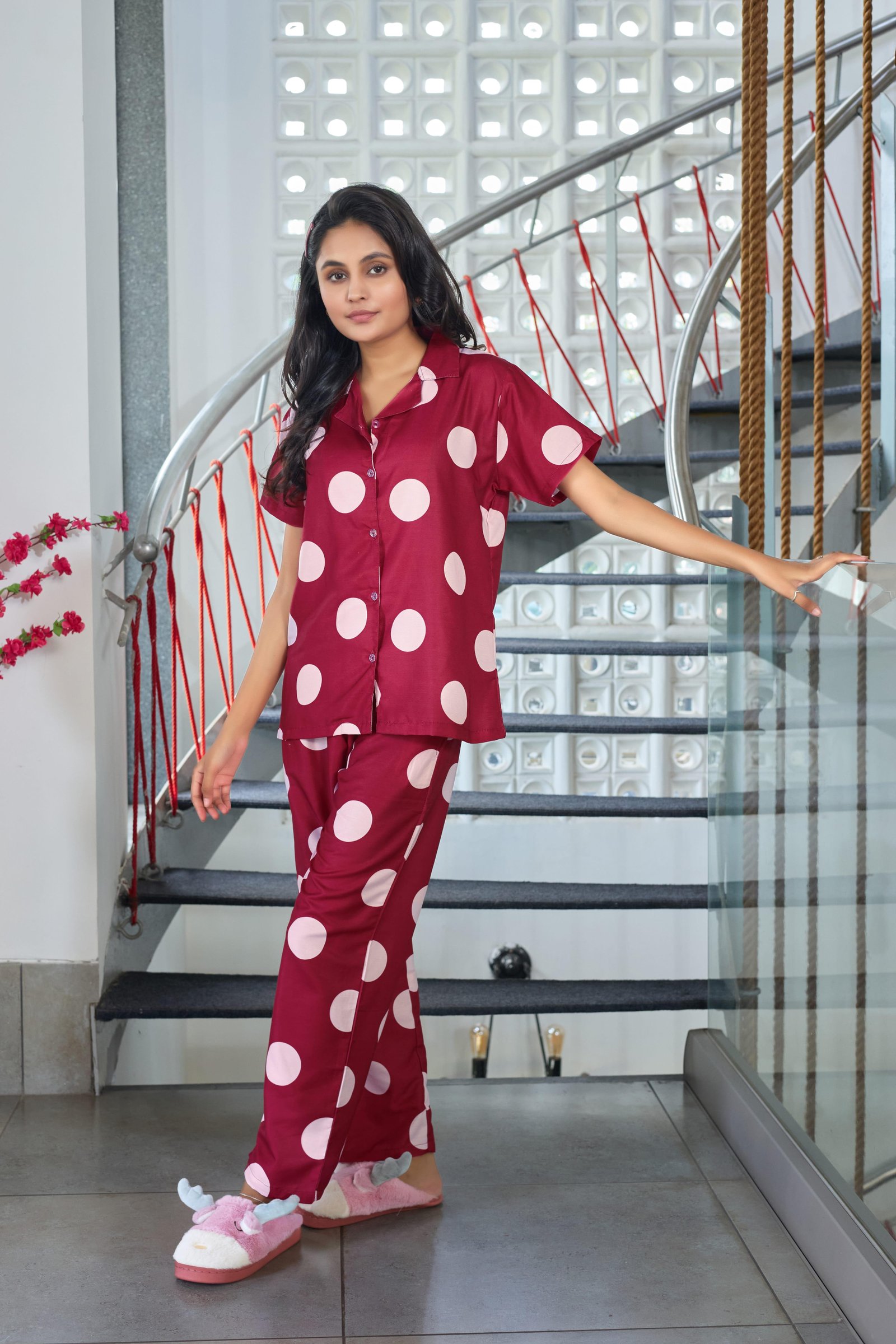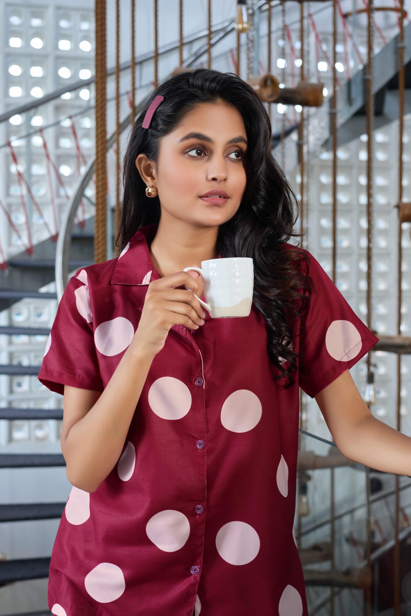 Add a playful charm to your bedtime routine with the Berry Bliss Polka Dot Nightwear Set. Crafted in a rich maroon shade with soft blush pink polka dots, this two-piece night suit blends comfort with a fun, stylish look. The short-sleeve, button-down shirt features a relaxed collar and smooth finish, paired with straight-fit pajama pants for all-night ease. Perfect for lounging at home, sleepwear, or cozy evenings.