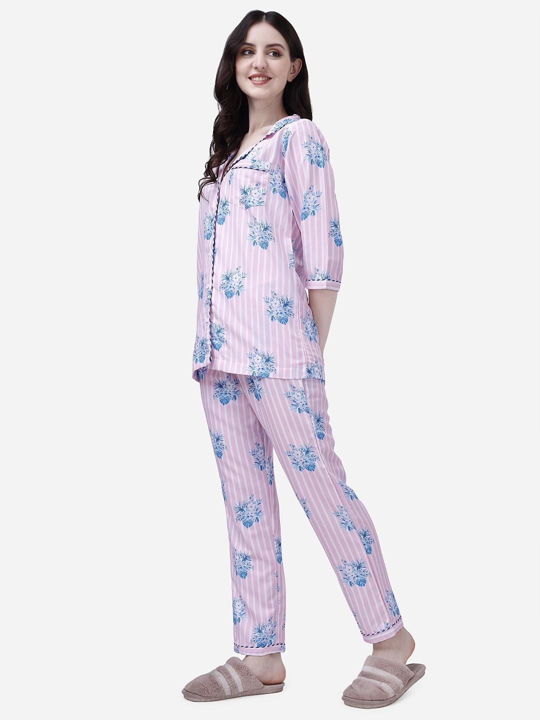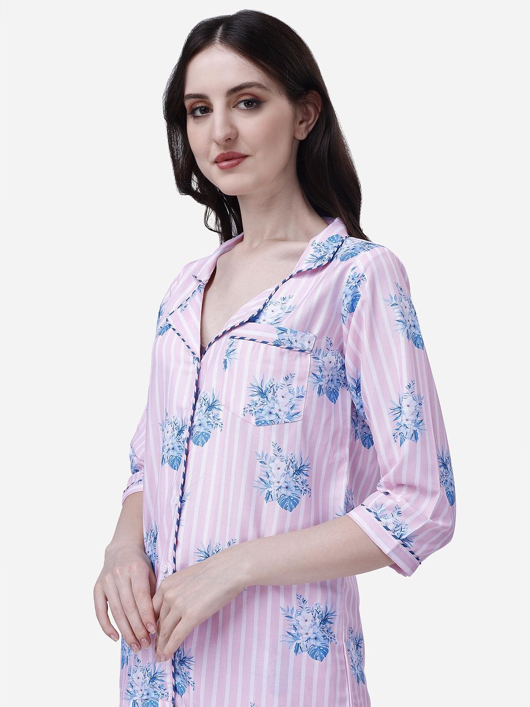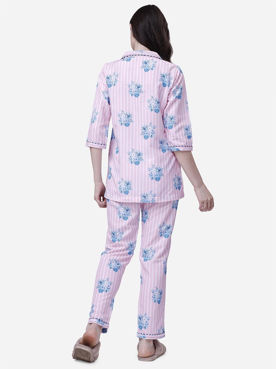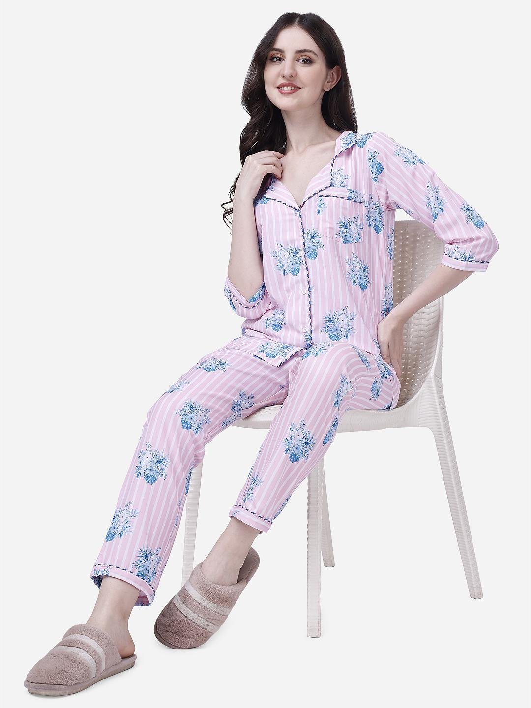 Upgrade your nightwear wardrobe with this elegant Women’s Floral Printed Night Suit Set. Featuring a soft pink striped base enhanced with soothing blue floral prints, this nightwear set includes a button-down shirt style top with a comfortable collar and full-length pajama bottoms. Crafted from breathable, skin-friendly fabric, it offers all-night comfort while maintaining a stylish look. Perfect for sleeping, lounging, or relaxed home wear, this night suit combines comfort, elegance, and everyday practicality.