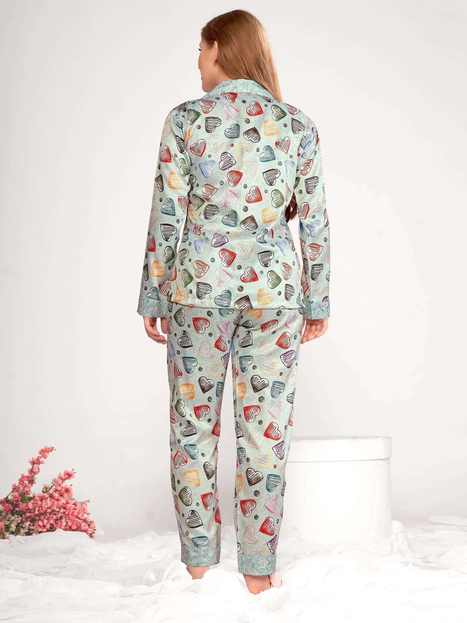 Add charm and comfort to your nightwear wardrobe with this stylish women’s printed night suit set. Designed in a refreshing mint green base, the set features a playful multicolor heart print that adds a cheerful touch. The button-down shirt-style top with a classic collar and full sleeves pairs perfectly with matching straight-fit pajamas. Crafted from soft, breathable fabric, this night suit ensures all-night comfort and is ideal for sleeping, lounging, or relaxed home wear.