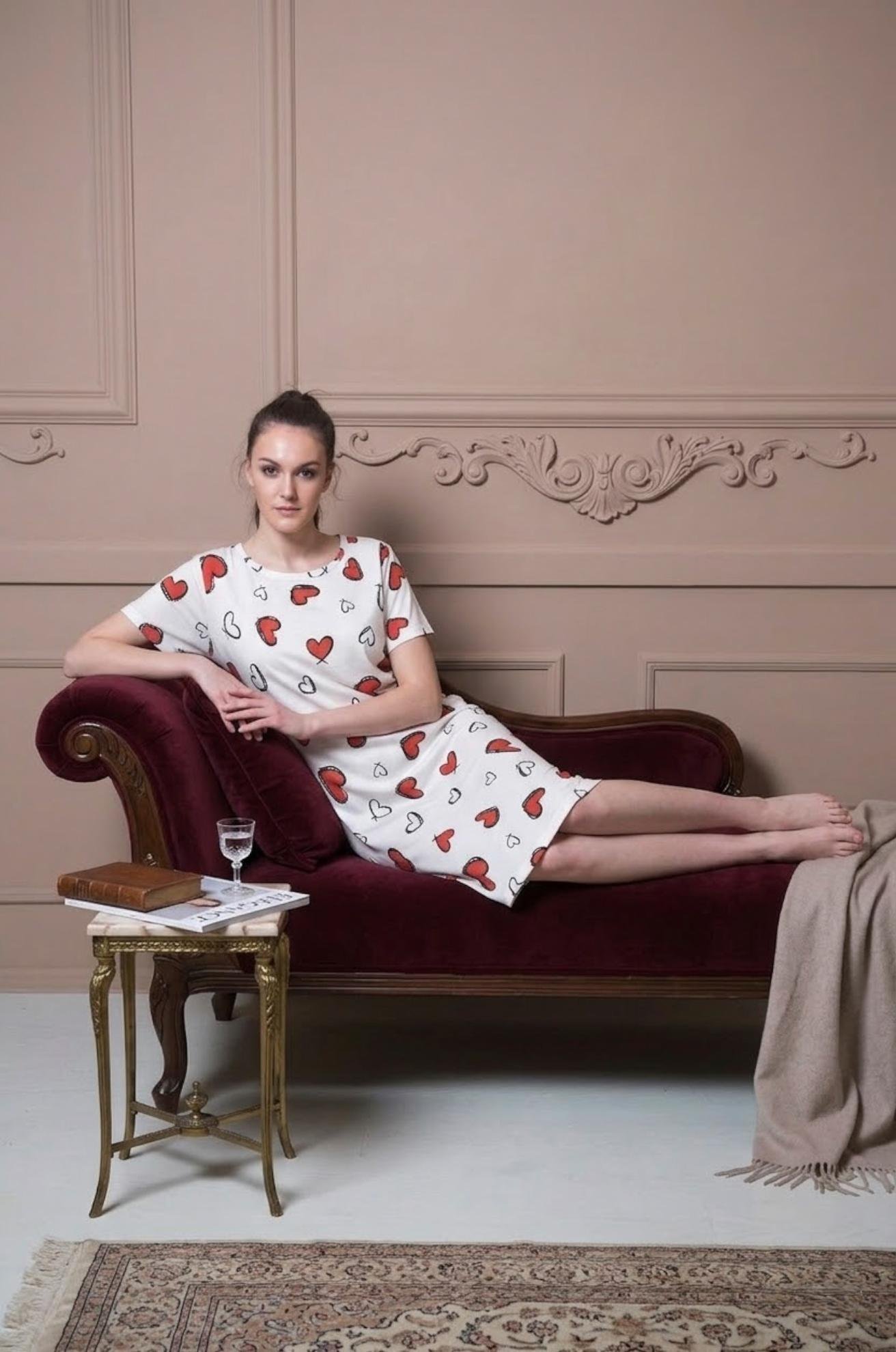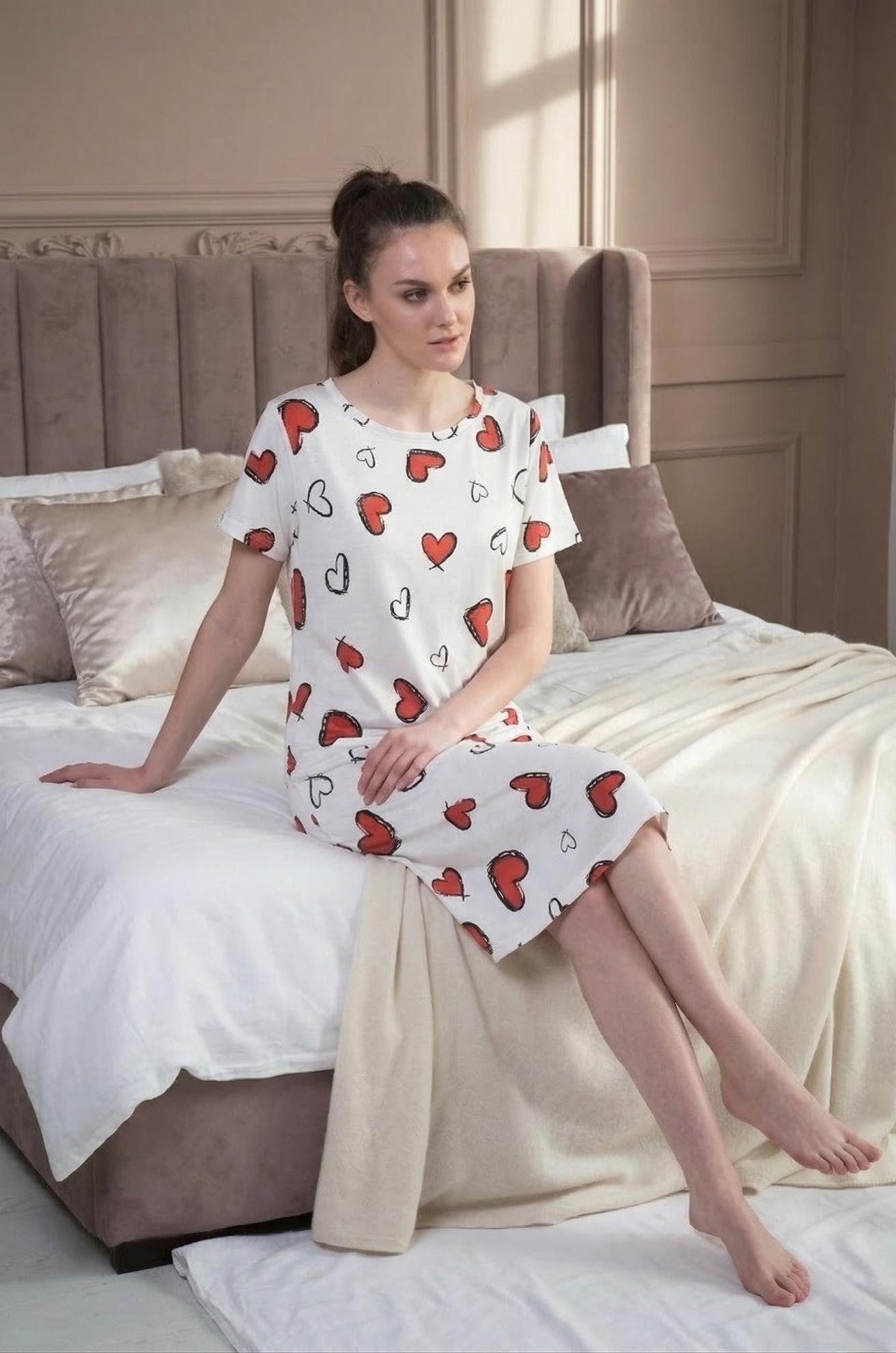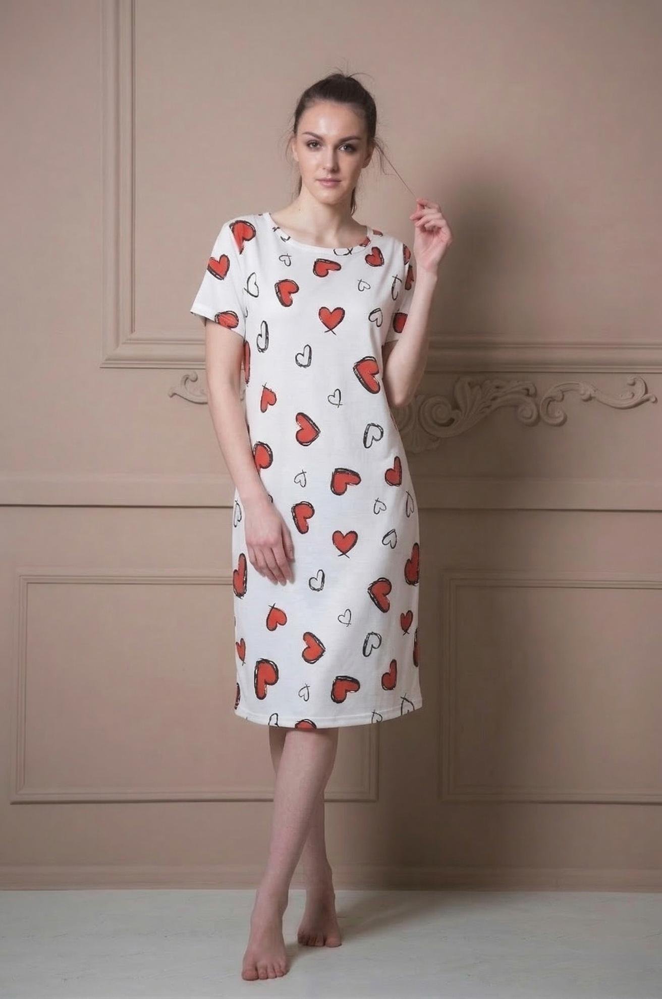 Buy Cotton Short Nighty Online in India. Stay cozy and stylish with this white heart print night dress, designed for effortless comfort and a charming look. Featuring playful red and black heart motifs on a clean white base, this night dress adds a romantic touch to your sleepwear collection. The soft, lightweight fabric drapes smoothly over the body, making it perfect for peaceful sleep, lounging, or relaxed home wear.