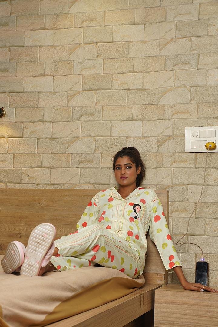 Stay comfortable and stylish at home with this Cream Yellow Women’s Floral Print Night Suit Set. Designed with a soothing cream base and soft floral patterns, this nightwear set features a full-sleeve button-down shirt paired with matching pajama pants. Made from lightweight, breathable fabric, it provides a relaxed fit for uninterrupted sleep and all-day lounging. Perfect for daily nightwear, home wear, or relaxed mornings.