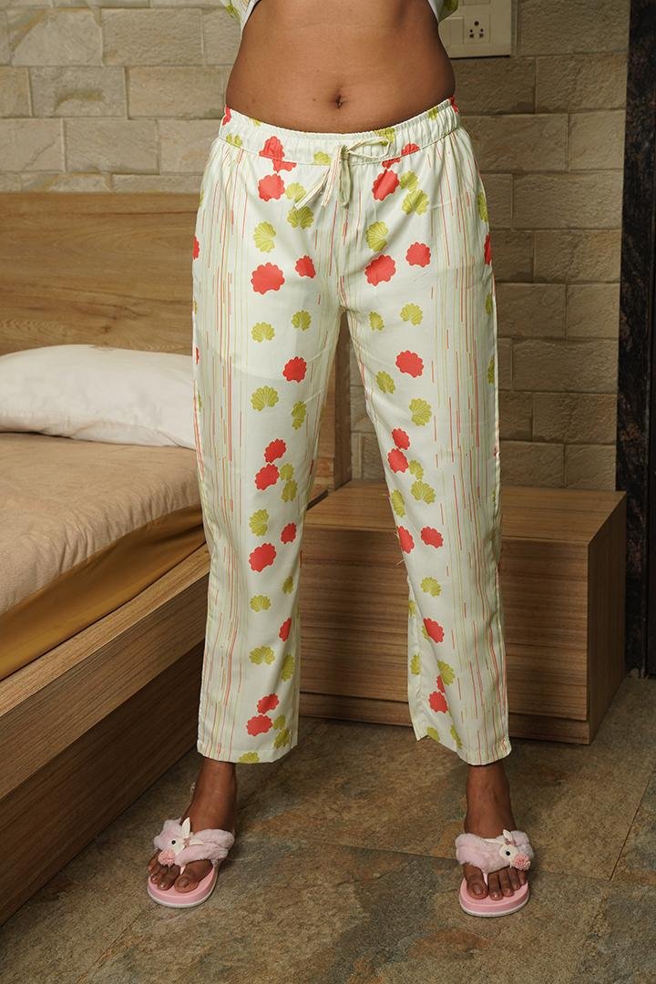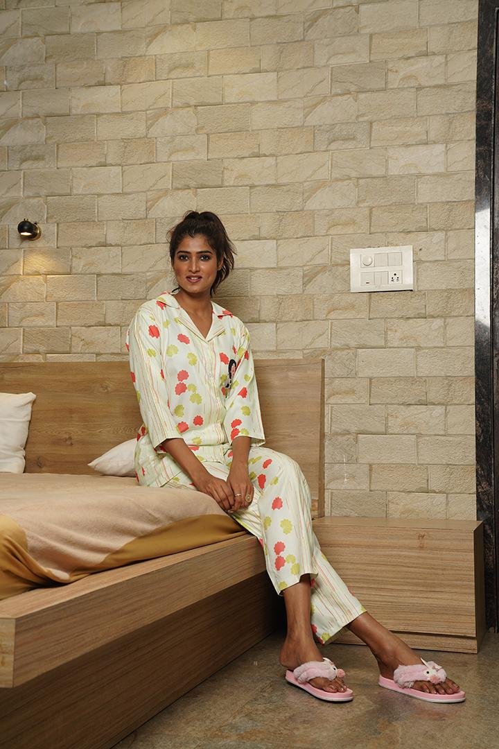 Cream Yellow Floral Print Beige Pajama Set