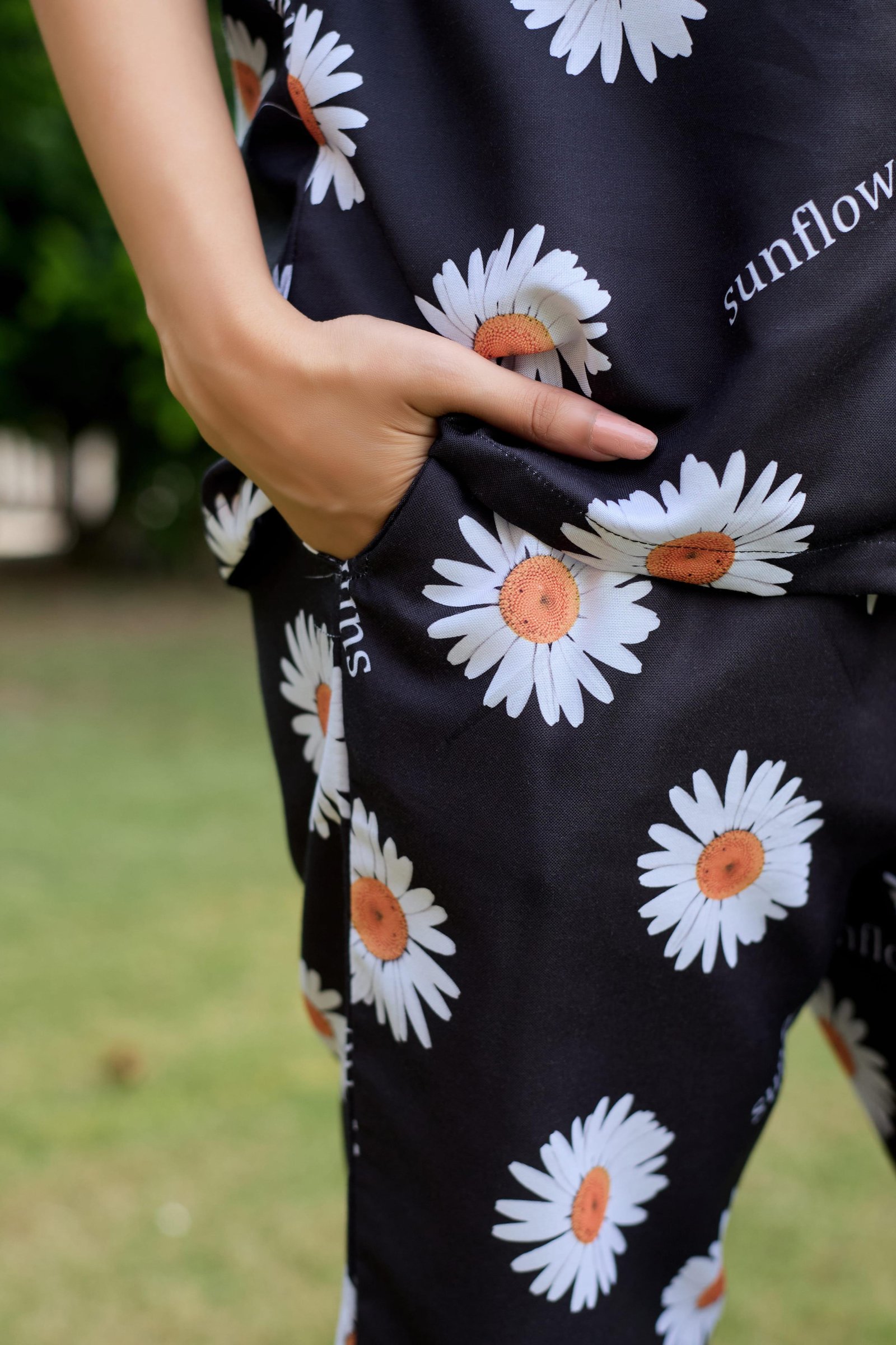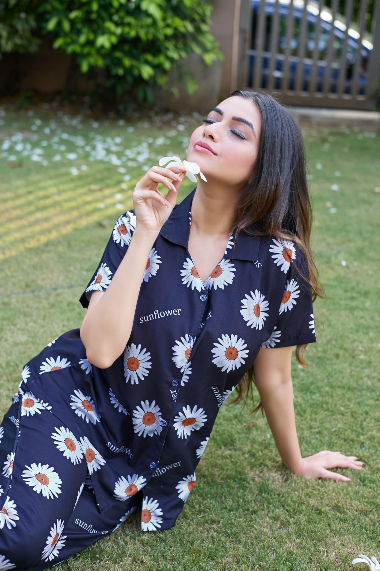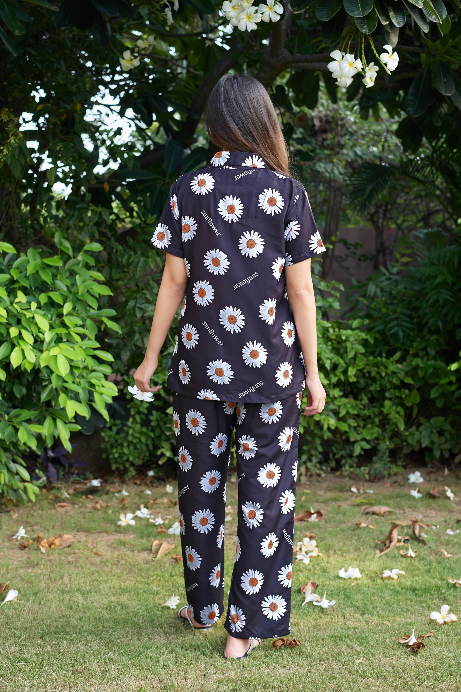 Bring a touch of nature to your nighttime routine with this Sunflower Print Cotton Nightwear Co-Ord Set. Crafted from soft, breathable cotton, this two-piece set includes a short-sleeve button-down shirt and matching straight-fit pajama pants. The elegant black base is beautifully highlighted with cheerful sunflower motifs, creating a stylish yet cozy look perfect for sleeping or relaxed lounging.