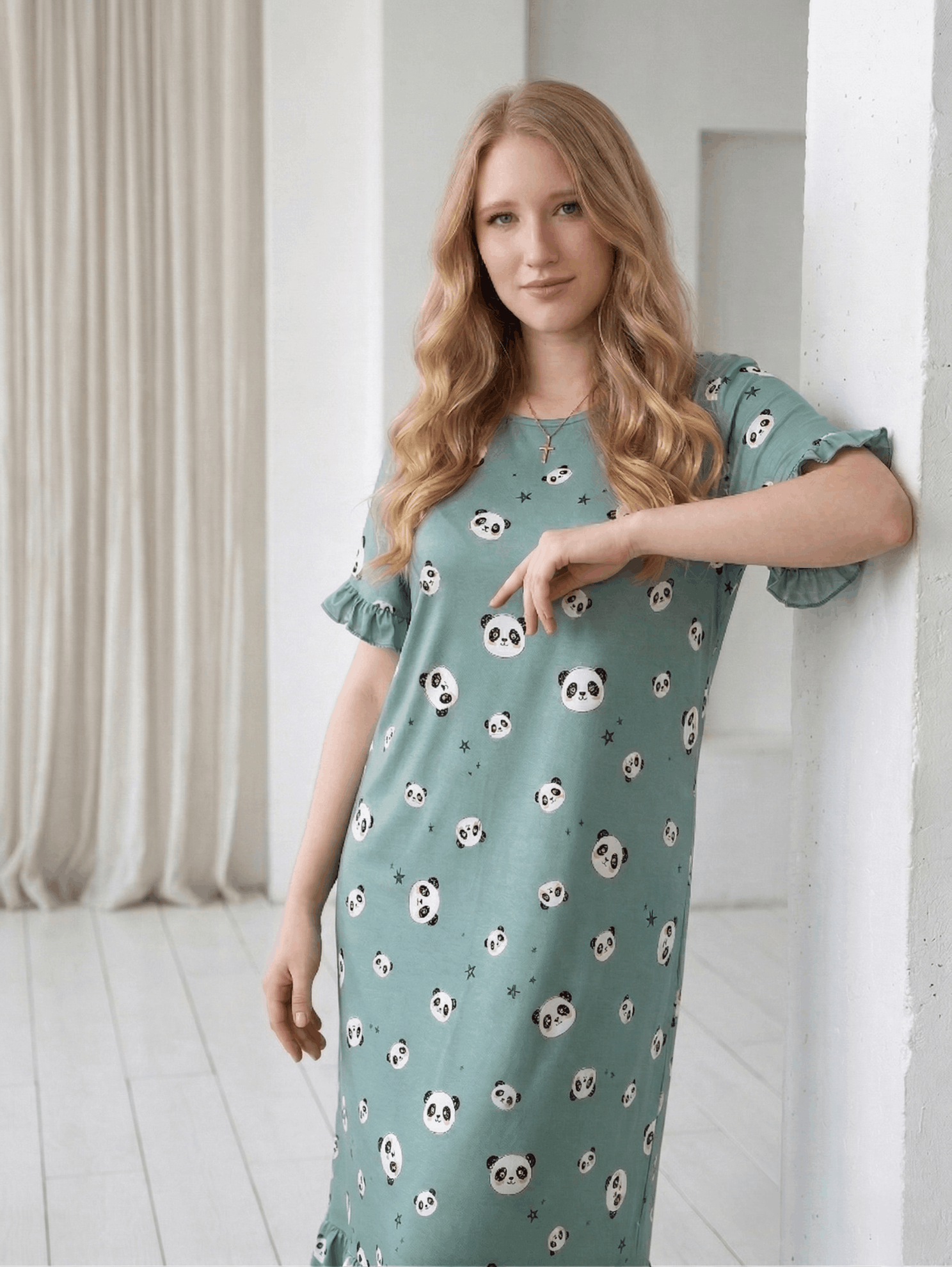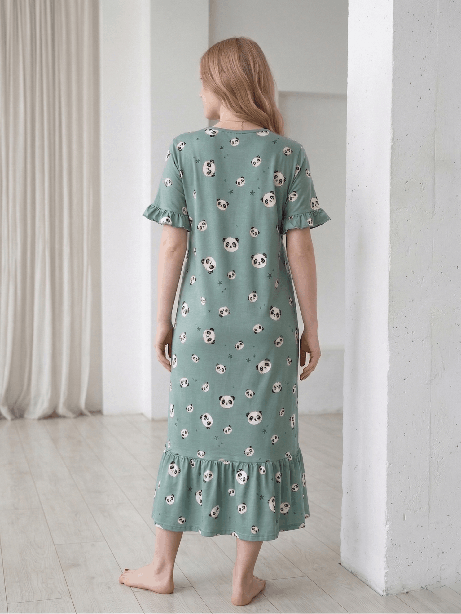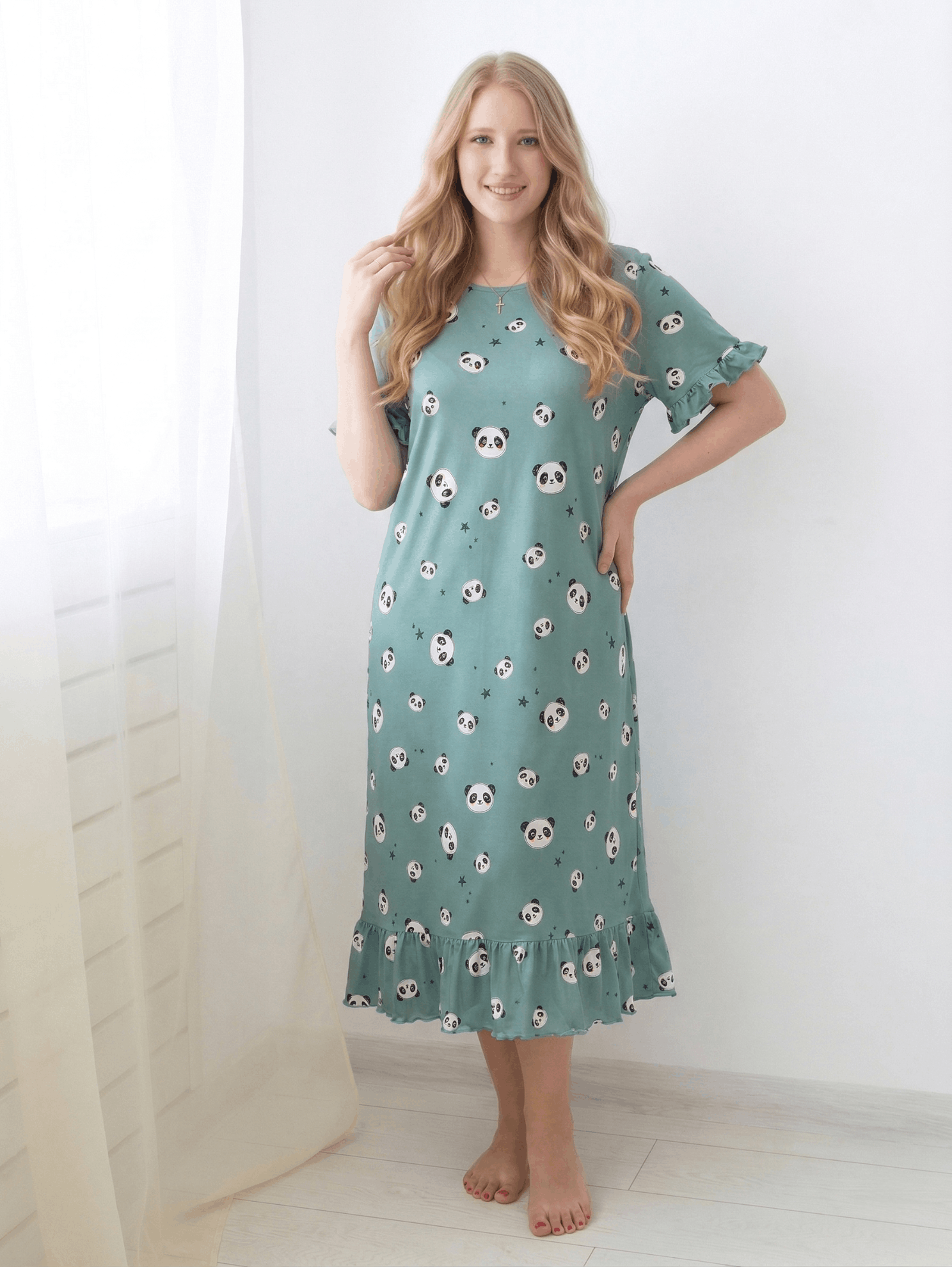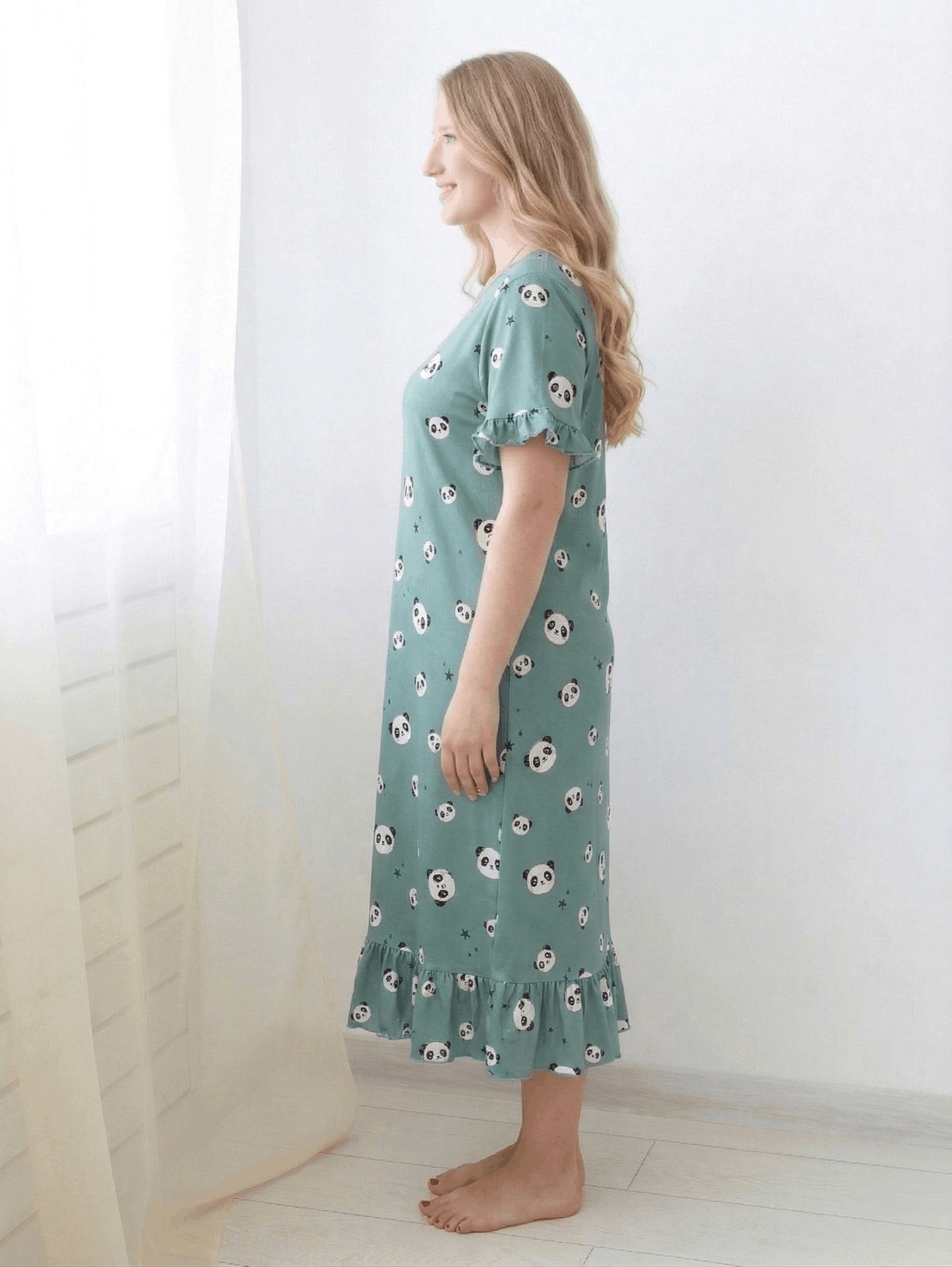 Buy Satin Long Nighty for Women Online. Enjoy cozy nights with this adorable teal green panda print nighty, designed for comfort and effortless style. Featuring cute panda and star prints, this long night dress is made from soft, breathable fabric that feels gentle on the skin. The relaxed fit, short frill sleeves, and frill hemline provide easy movement and a stylish finish. Perfect for nightwear, lounging, or relaxed home wear.
