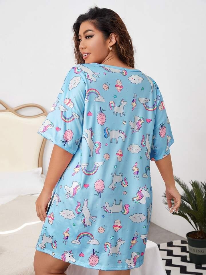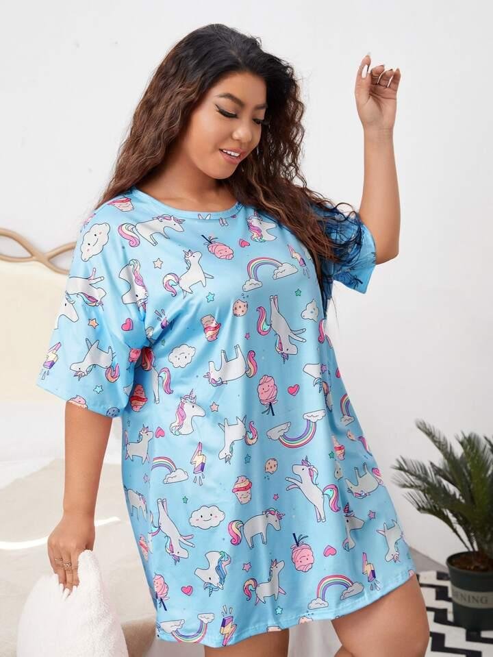 Buy Short Nighty for Women Online. Drift off to dreamland in this charming plus-size sleep shirt. Made for comfort, this loose-fitting nightgown features a whimsical cartoon print of unicorns, rainbows, clouds, and sweet treats on a soft light blue background. The classic t-shirt style with short sleeves and a round neckline ensures a relaxed and cozy fit for a peaceful night's sleep or casual lounging at home.