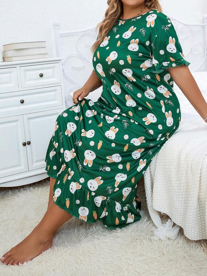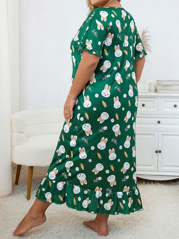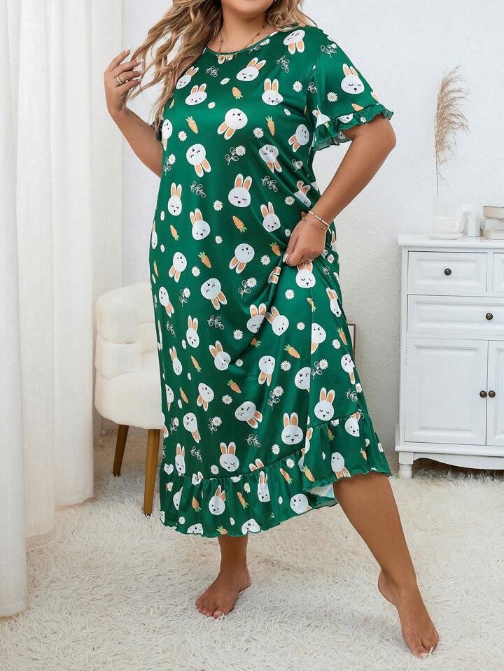 Buy Women Long Nighty with Robe Online in India. Upgrade your nightwear collection with this charming green bunny print nighty. Designed for both comfort and style, this long night dress features cute rabbit and carrot prints that give it a playful yet elegant look. Made from soft, breathable fabric, it ensures all-night comfort. The frill hem and short sleeves add a stylish touch, making it ideal for sleeping, lounging, or relaxed home wear.