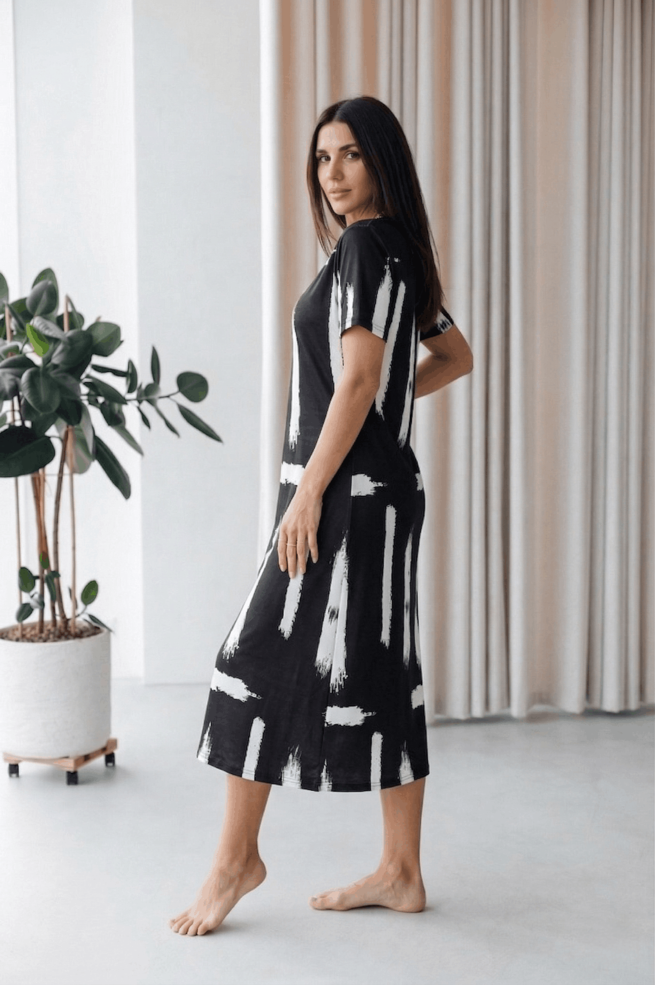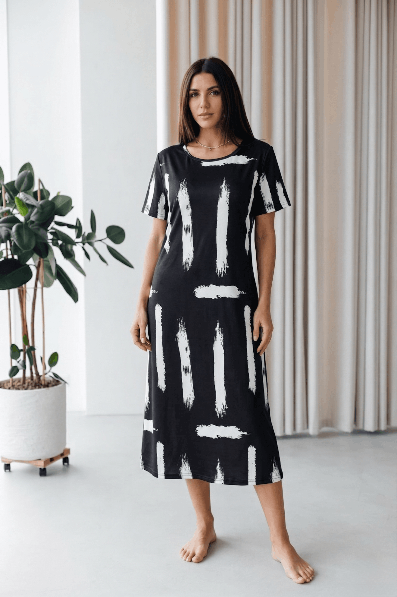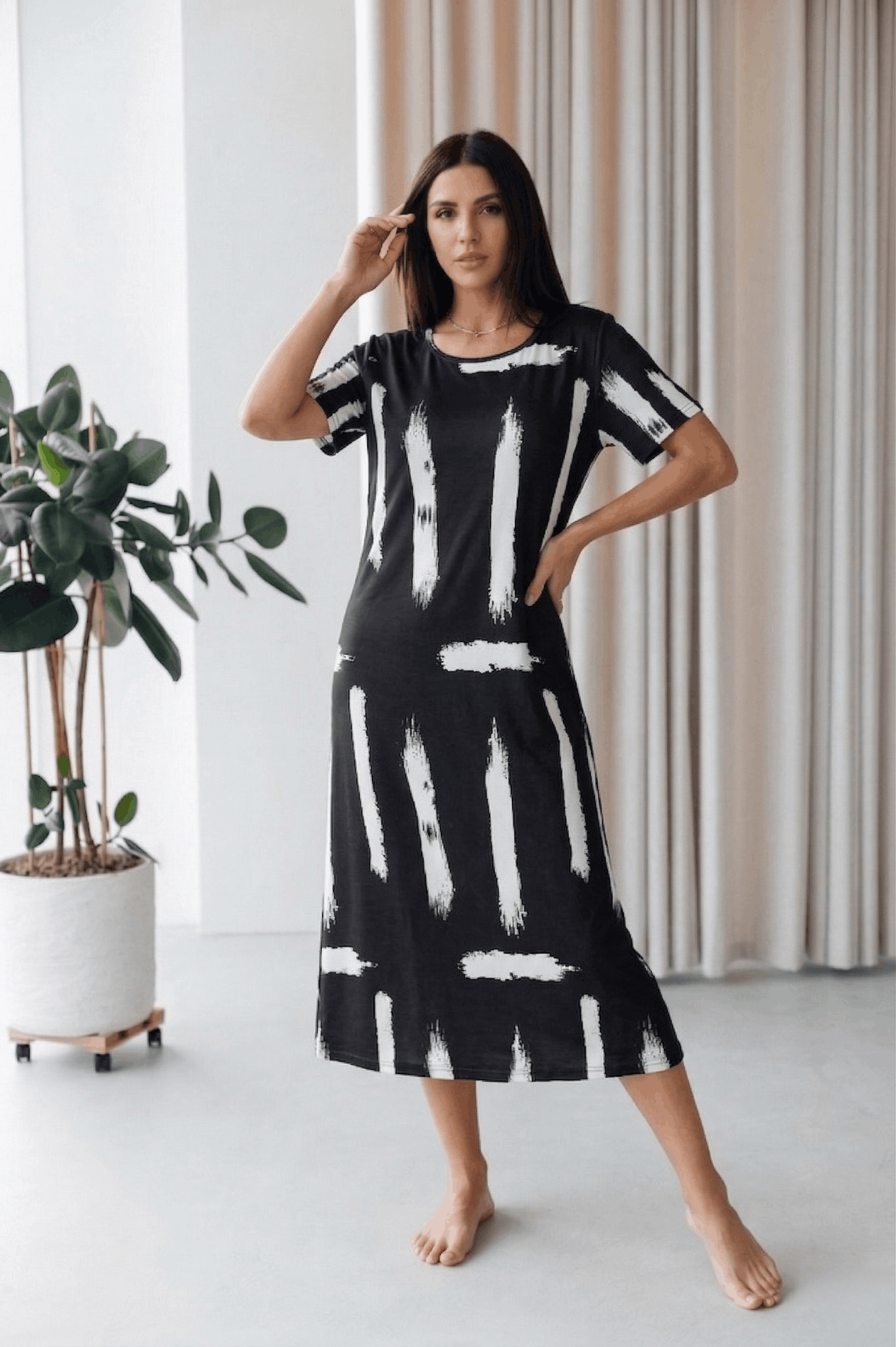 Cotton Long Nighty for Women. Make a bold yet effortless statement with the Midnight Brushstroke Relaxed Maxi Dress. Featuring an artistic black base accented with striking white brushstroke prints, this dress blends modern design with everyday comfort. The loose, straight silhouette drapes beautifully for a flattering fit, while the soft, breathable fabric makes it ideal for lounging, casual days, or relaxed evenings at home. Simple, stylish, and endlessly comfortable—this maxi dress is an easy go-to for understated sophistication.