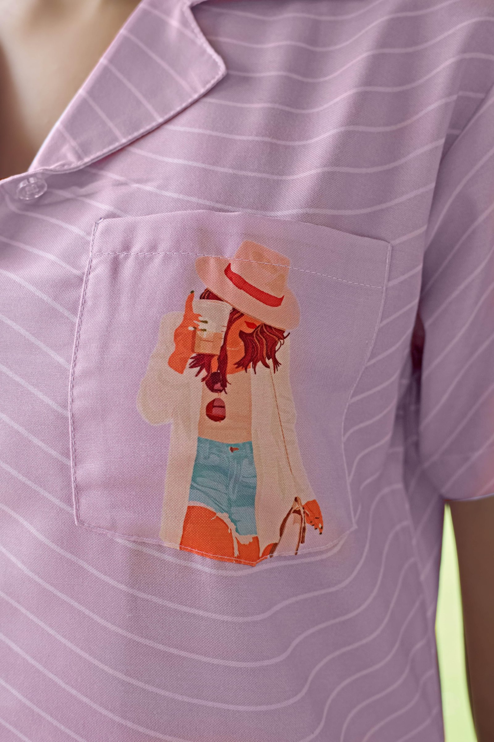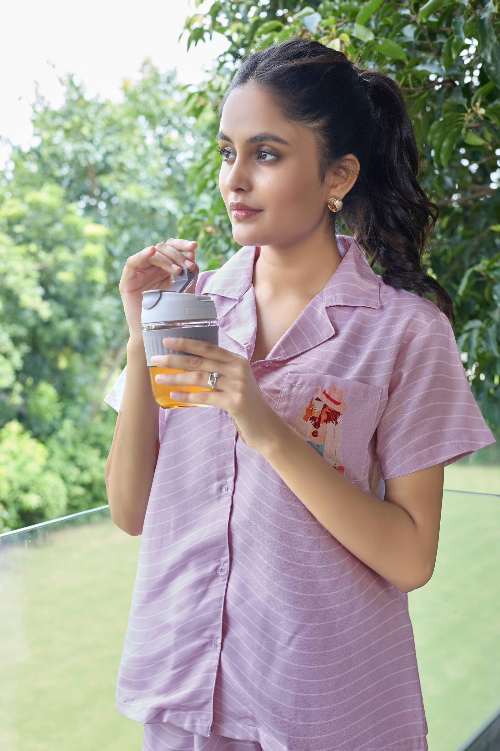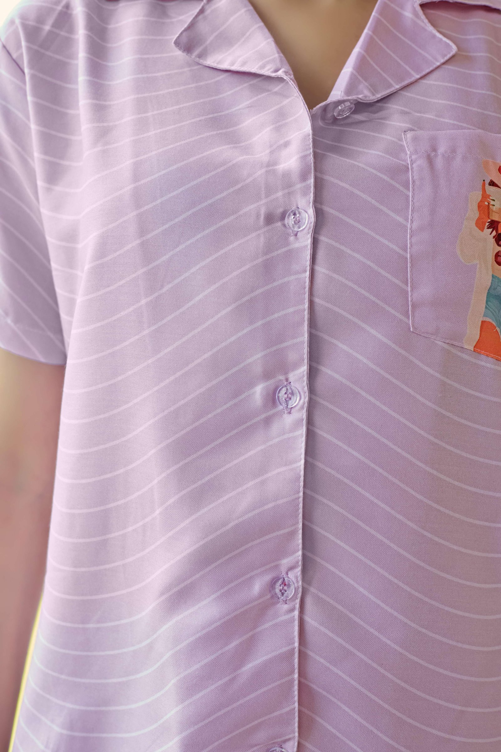 Stay effortlessly comfortable and stylish with the Lavender Mist Striped Nightwear Set. Designed in a soothing lavender tone with subtle white wave stripes, this two-piece set offers a calm, minimal look perfect for everyday lounging and peaceful sleep. The short-sleeve, button-down shirt features a neat collar and a cute embroidered chest detail, while the matching straight-fit pajama pants provide all-night comfort. Ideal for warm weather and relaxed home wear.