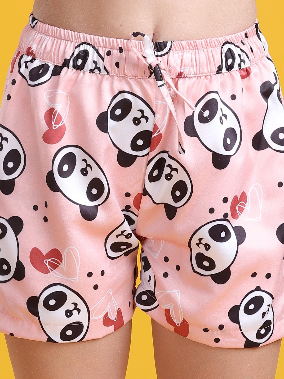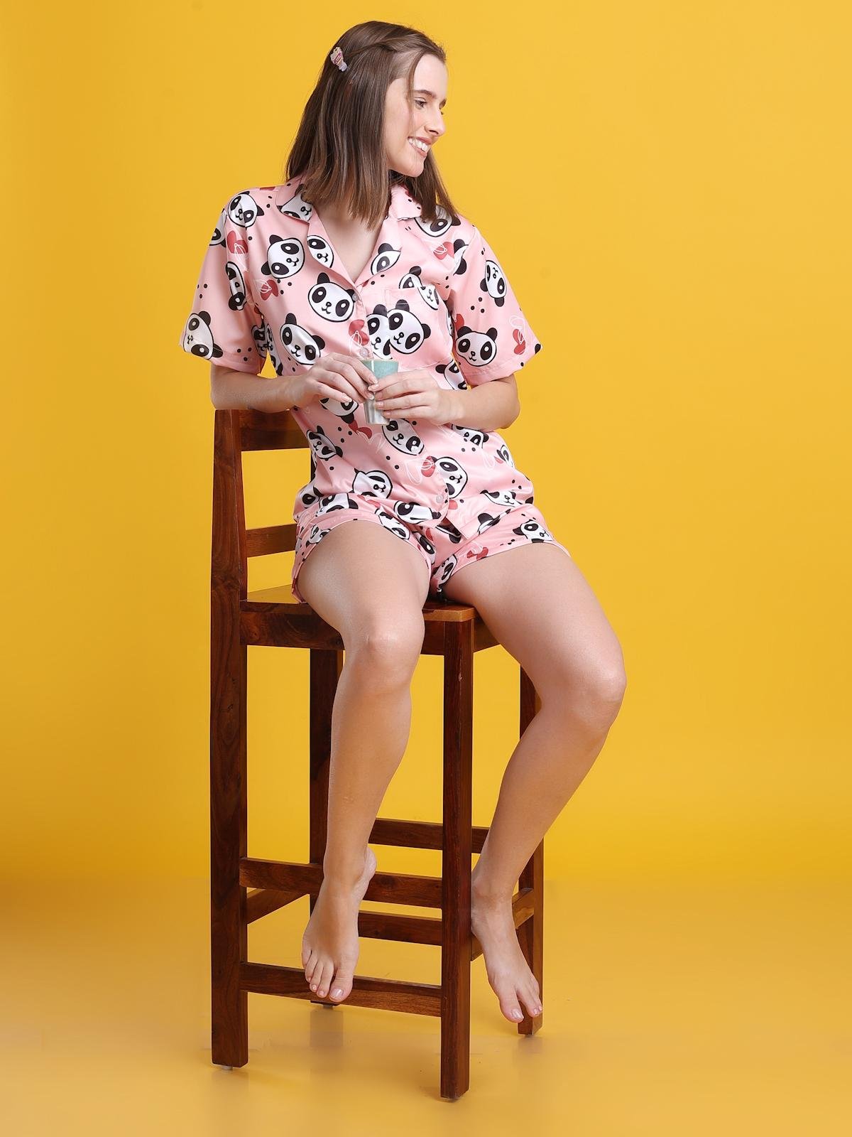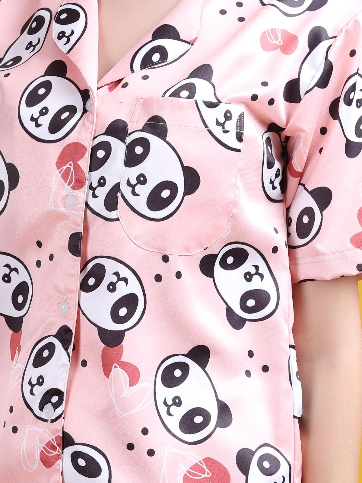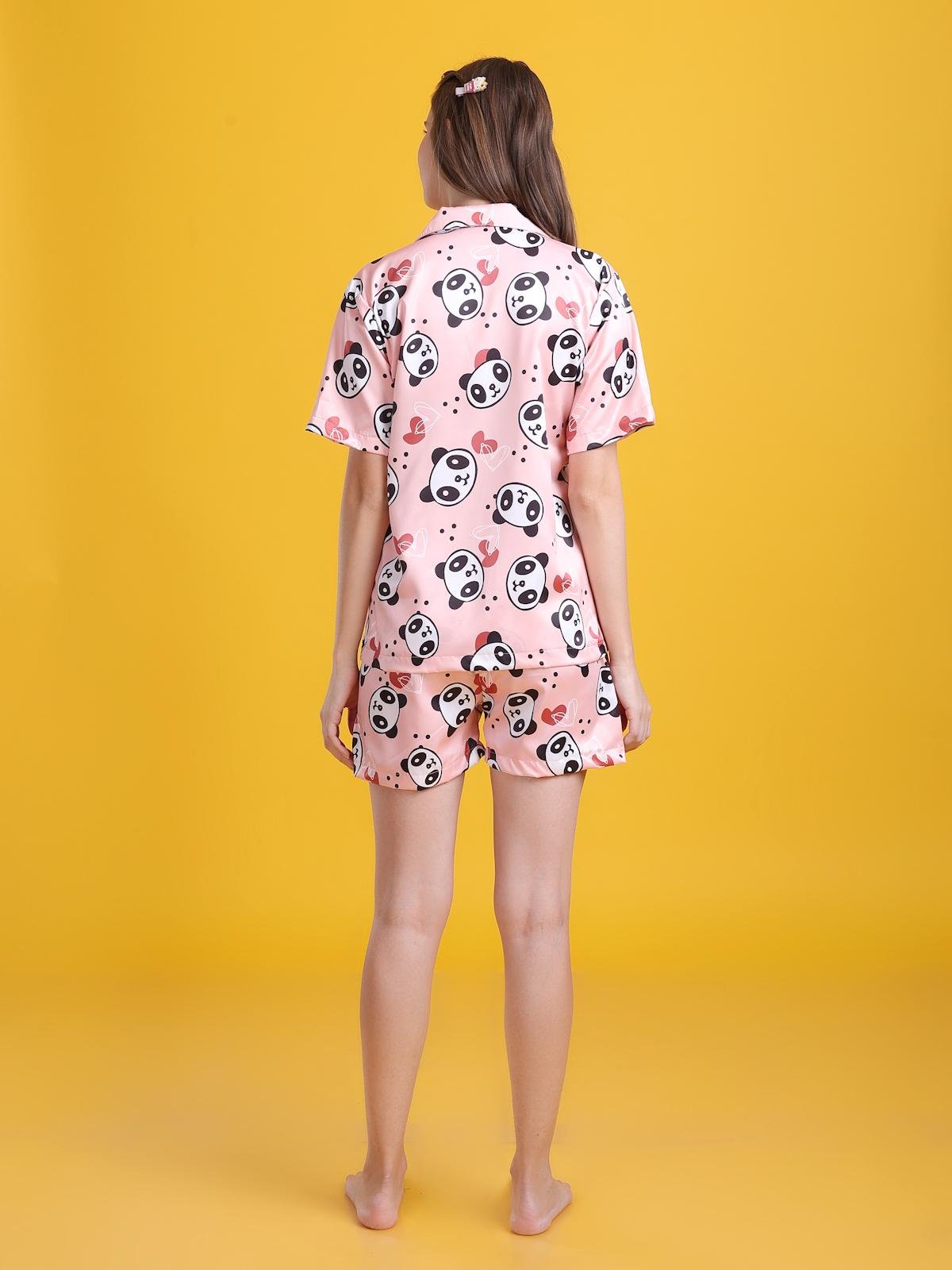 Sleep in style and comfort with this Women’s Pink Panda Print Nightwear Set, designed to add a fun and playful touch to your bedtime routine. Crafted in a soothing blush pink base, the set features adorable panda motifs with heart accents for a charming look. The button-down short-sleeve shirt offers a relaxed fit, while the matching shorts ensure easy movement and breathable comfort. Made from soft, lightweight fabric, this co-ord set is ideal for lounging, sleepwear, or relaxed days at home.