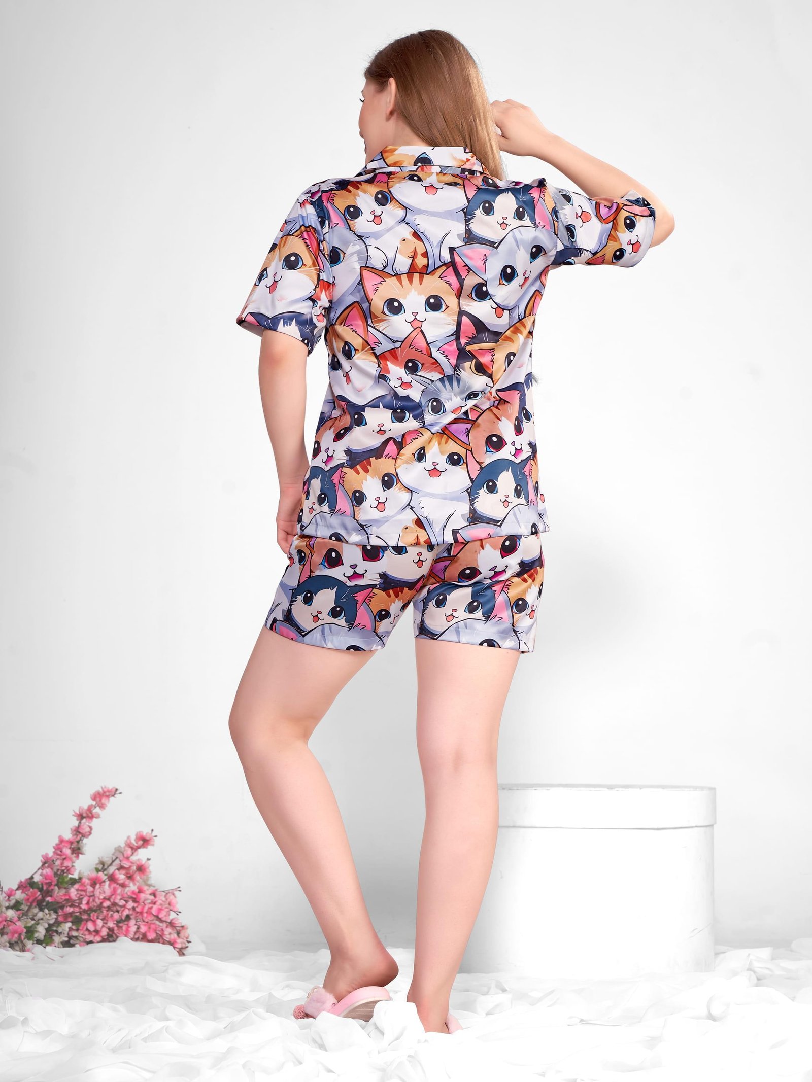 Add a fun and playful touch to your nightwear collection with this Women’s Multicolor Cat Print Night Suit Set. Designed with an adorable all-over cartoon cat print, this set includes a short-sleeve button-down shirt paired with matching shorts. Crafted from soft, breathable fabric, it offers ultimate comfort for sleeping, lounging, or relaxing at home. The lightweight material and relaxed fit make it perfect for everyday nightwear, especially during warm weather.
